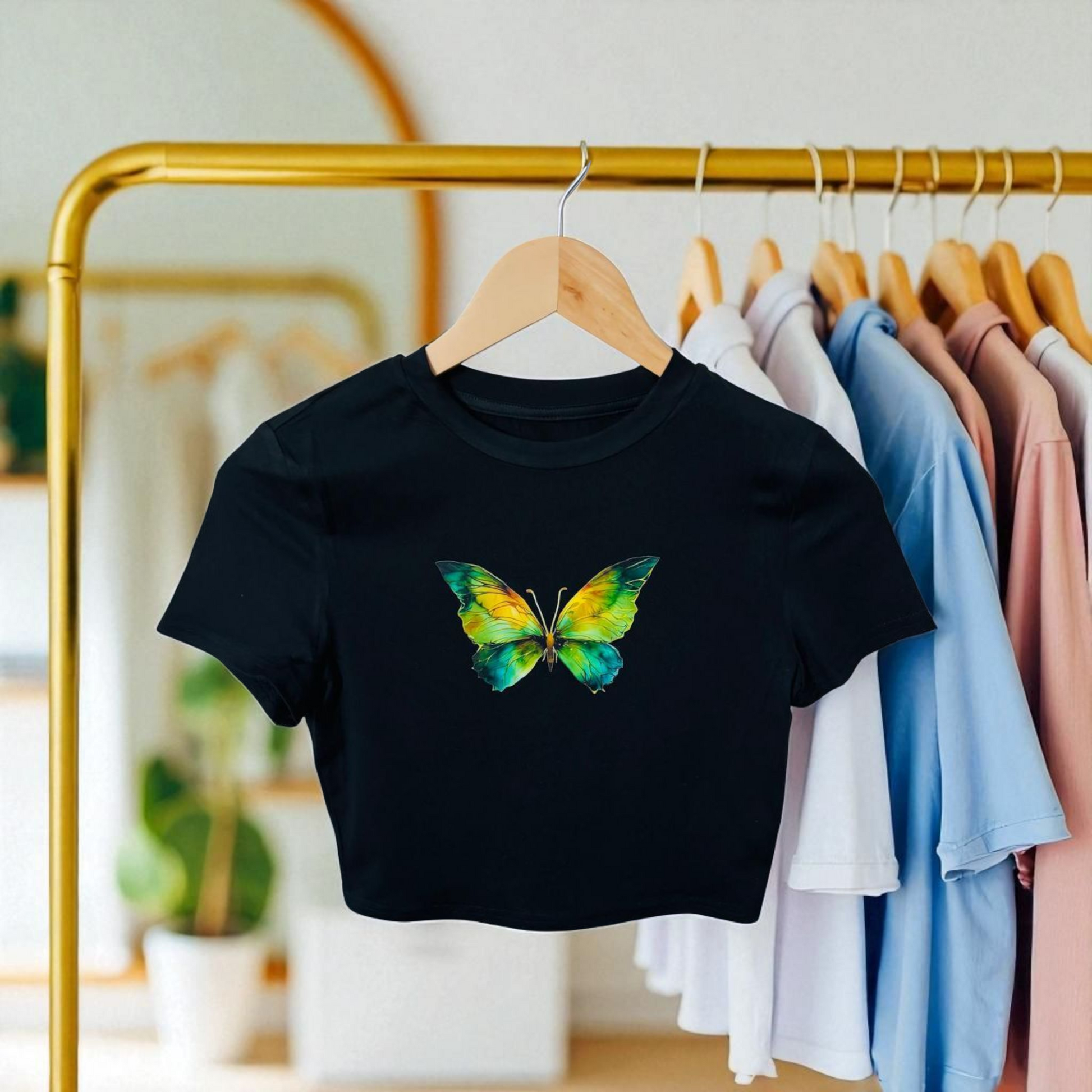 Add a pop of color and charm to your everyday wardrobe with our Women's Butterfly Cap Sleeve. Designed with a flattering fit, soft and breathable fabric, this top features an eye-catching, vibrant butterfly print.